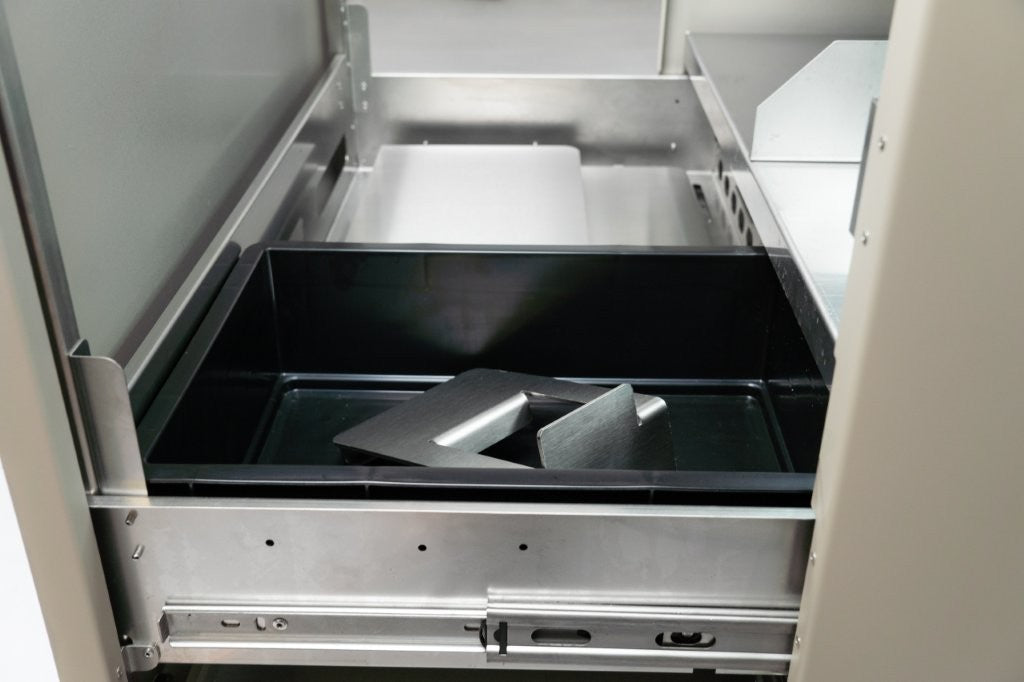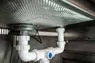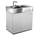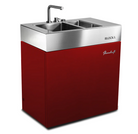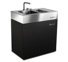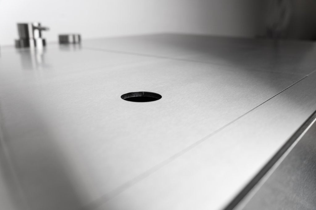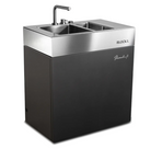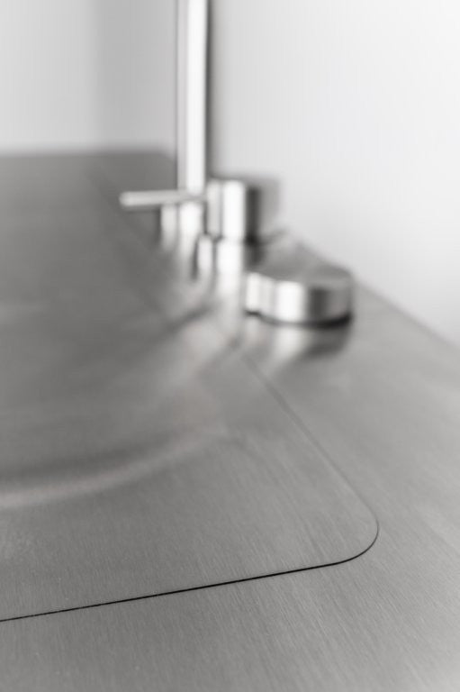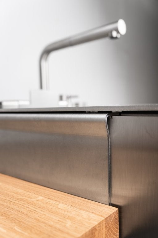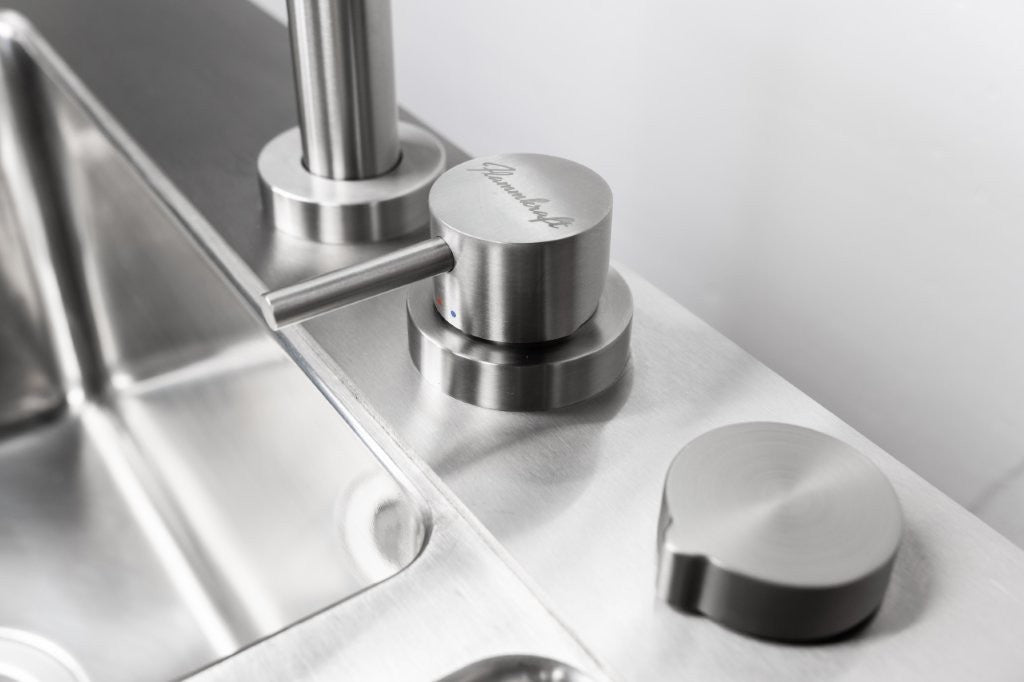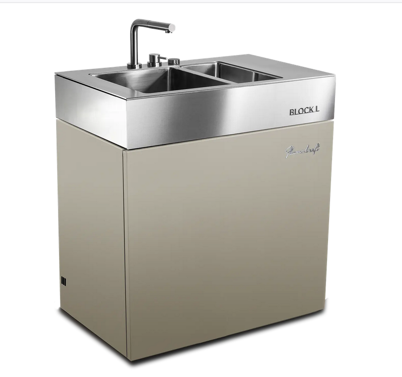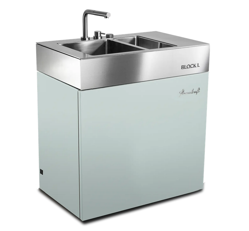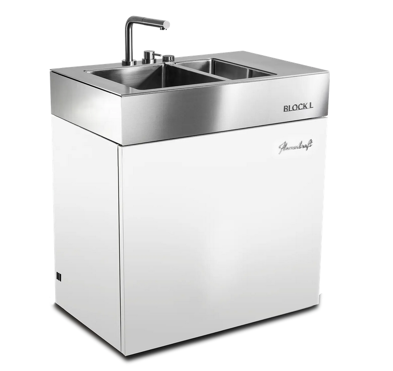 Die beiden Becken können mit passgenauen Edelstahleinlegern abgedeckt werden, um bei Bedarf zusätzliche Arbeitsfläche zu schaffen. Die Arbeitsplatte besteht aus gebürstetem massivem 4mm Edelstahl. Die Wasserversorgung erfolgt über eine lebensmittelechte Standard-Kupplung. Für die optionale Nutzung von Warm- und Kaltwasser ist der Block L mit einer Mischbatterie und einem Zweikreisanschluss ausgestattet. Für die Abführung des Wassers stehen mehrere Varianten zur Verfügung.