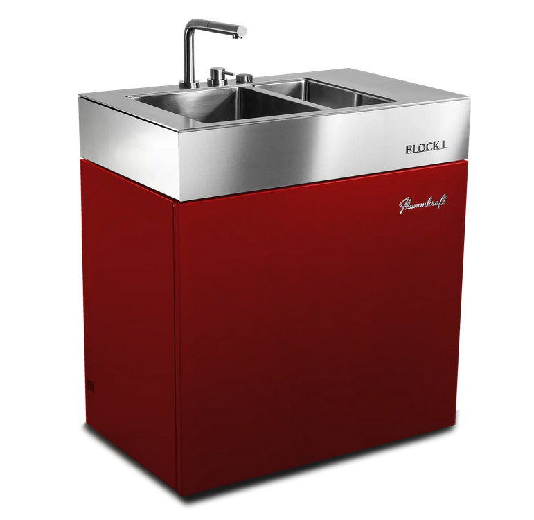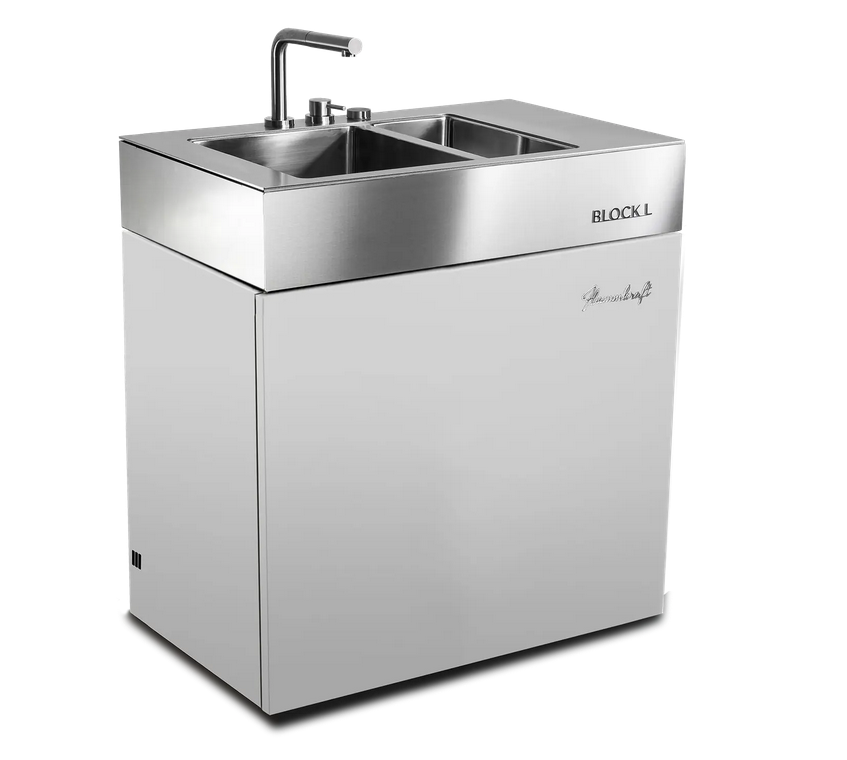 Ausgestattet mit einem isolierten Doppelwaschbecken und einem schwenkbaren sowie versenkbaren Wasserhahn mit ausziehbaren Kopf. So ermöglicht der Block L das direkte Waschen und Verarbeiten von Lebensmitteln oder Händewaschen im Außenbereich. Unnötige Wege ins Haus werden so eingespart. Der mitgelieferte Edelstahl-Halter für Sous-Vide-Sticks erweitert die Möglichkeiten zusätzlich.
