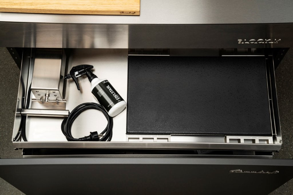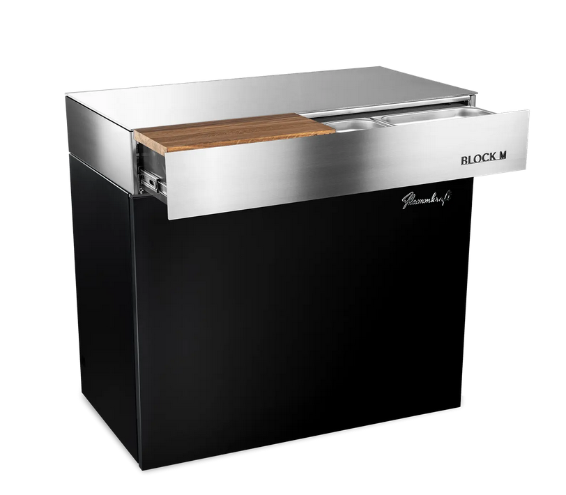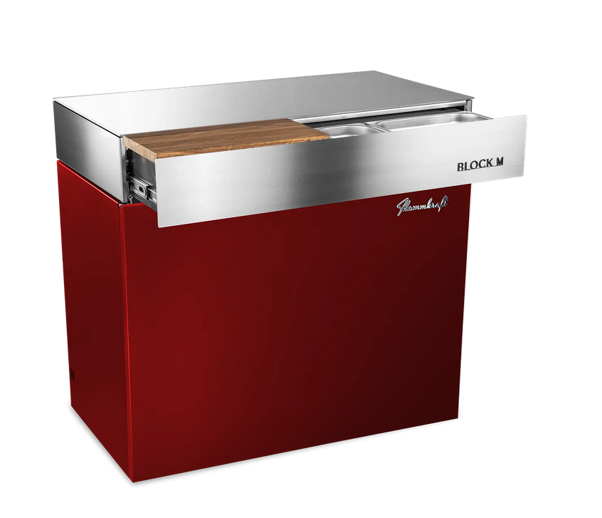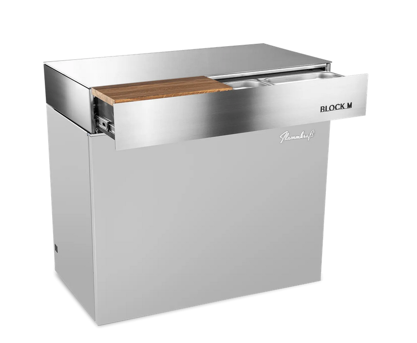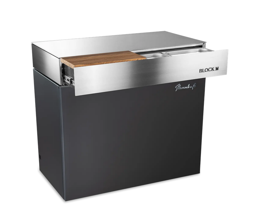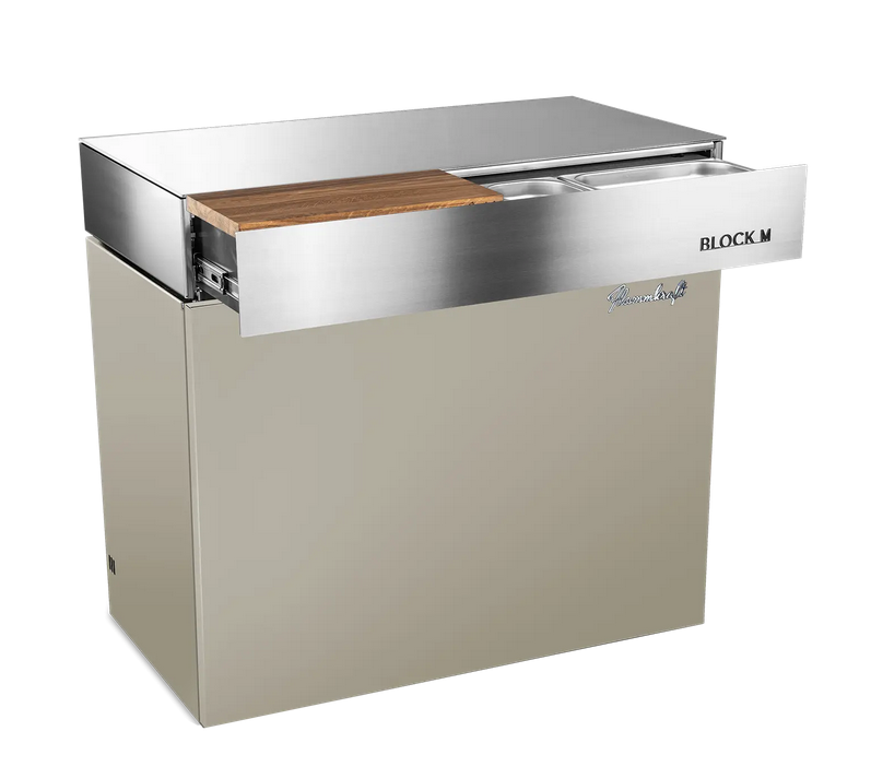 Unser Outdoor-Küchenmodul "BLOCK M" wurde in seiner neuesten Version an den BLOCK D (Gen. 5) angepasst und verfügt nun ebenfalls über eine Tiefe von 53 cm. Zusätzlich wurde die Frontschublade des Unterbaus ebenfalls mit einer push-to-open Funktion ausgestattet. Die unsichtbaren Lenkrollen sind nun mit dem eigens für den BLOCK D (Gen. 5) entwickelten Bremssystem ausgestattet. Ein größerer Durchmesser der Edelstahlrollen sorgt zudem für ein zusätzlich verbessertes Lenkverhalten und Mobilität, trotz der massiven Bauweise und den 130 kg, die er auf die Waage bringt. Zusätzliche Stabilität und Möglichkeiten zur Ausrichtung bieten vier robuste Füße. Die bewährten Vorteile und Funktionen des BLOCK M werden natürlich beibehalten. Hergestellt aus 100% Edelstahl und in den sieben Farben des BLOCK D erhältlich, bietet der BLOCK M (Gen. 5) zahlreiche Aufbewahrungsmöglichkeiten für Zubehör in zwei großen Edelstahl-Schubladen. Auch der integrierte Abfallbehälter, das Schneid- und Servierbrett aus geöltem Eichenholz, sowie die Aufbewahrungs- und Reinigungsbox sind weiterhin enthalten. Der BLOCK M (Gen. 5) bietet damit eine bequeme Lösung für die Vorbereitung und Bereitstellung von Zutaten.