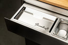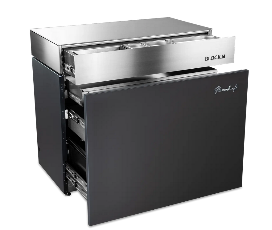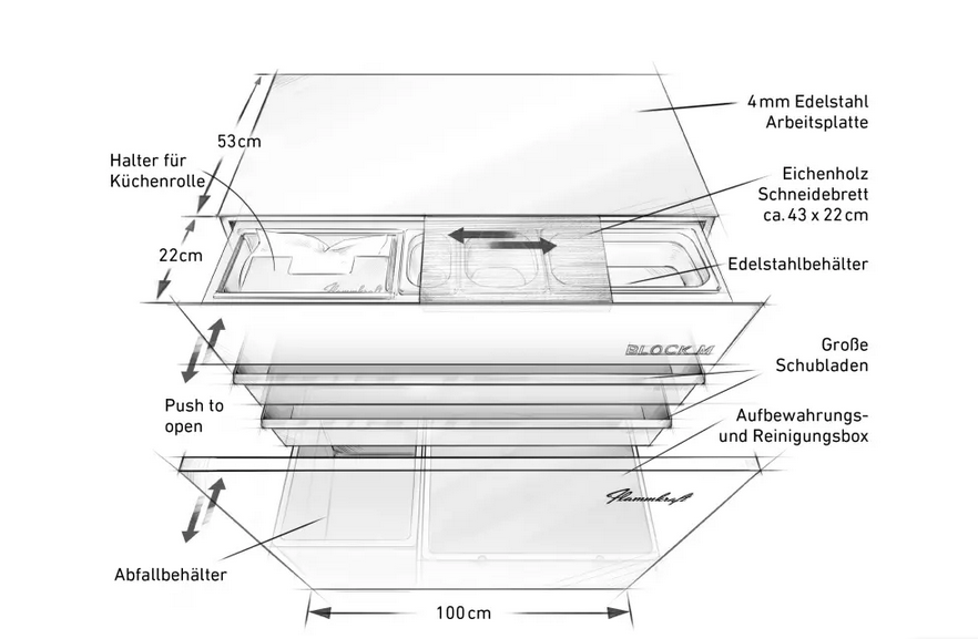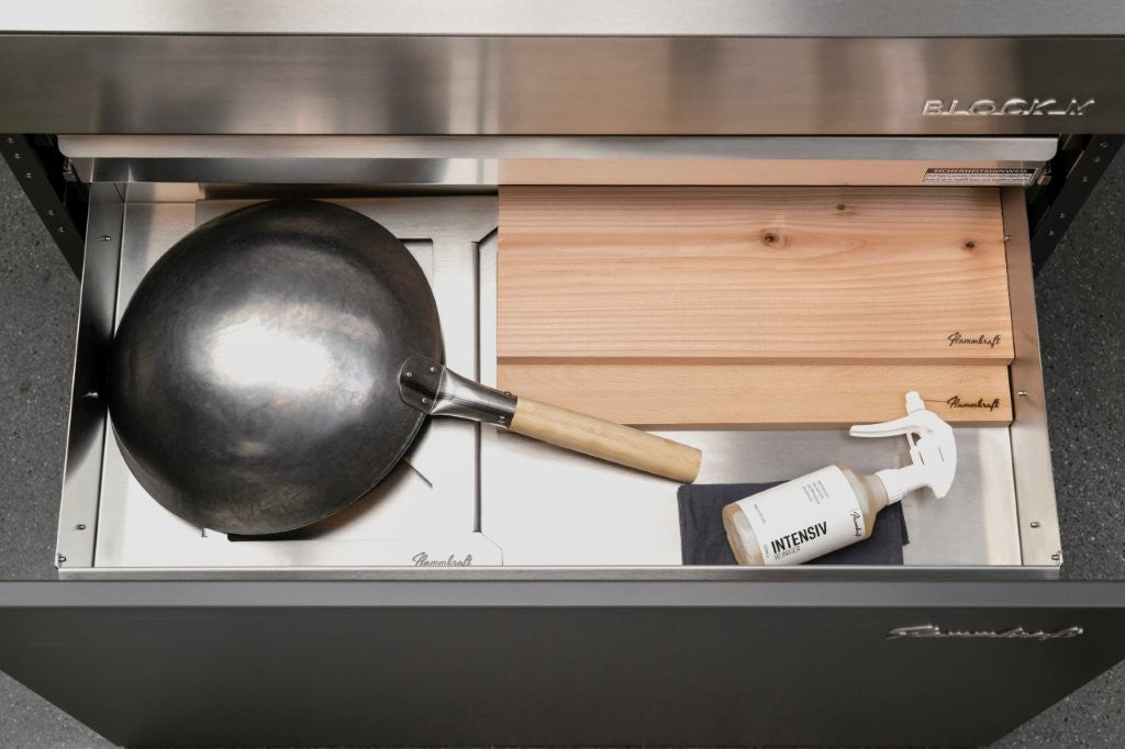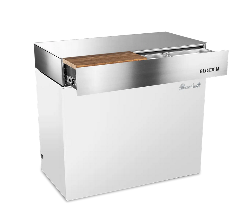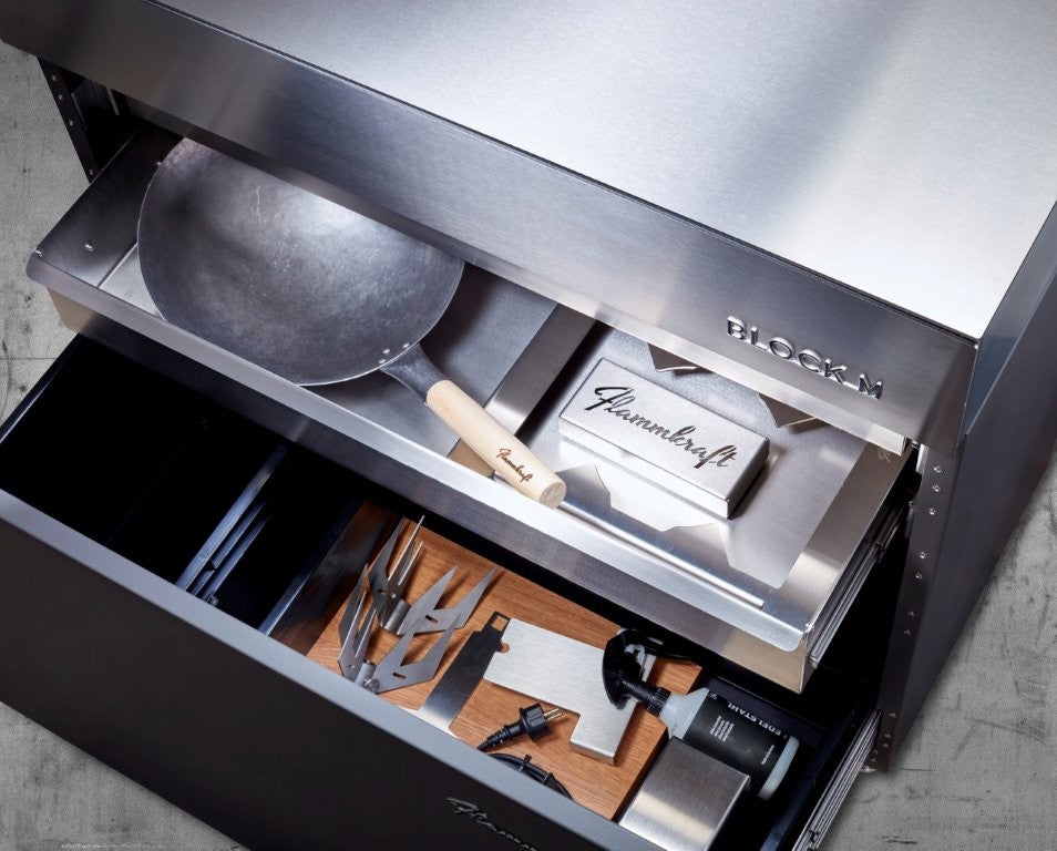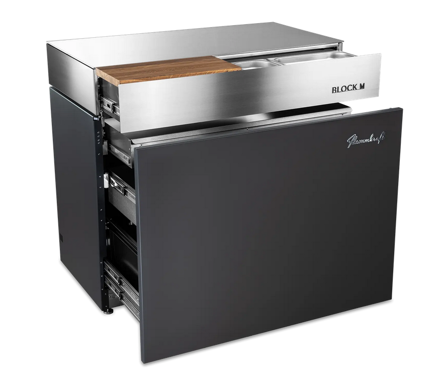 Unser Outdoor-Küchenmodul "BLOCK M" wurde in seiner neuesten Version an den BLOCK D (Gen. 5) angepasst und verfügt nun ebenfalls über eine Tiefe von 53 cm. Zusätzlich wurde die Frontschublade des Unterbaus ebenfalls mit einer push-to-open Funktion ausgestattet. Die unsichtbaren Lenkrollen sind nun mit dem eigens für den BLOCK D (Gen. 5) entwickelten Bremssystem ausgestattet. Ein größerer Durchmesser der Edelstahlrollen sorgt zudem für ein zusätzlich verbessertes Lenkverhalten und Mobilität, trotz der massiven Bauweise und den 130 kg, die er auf die Waage bringt. Zusätzliche Stabilität und Möglichkeiten zur Ausrichtung bieten vier robuste Füße. Die bewährten Vorteile und Funktionen des BLOCK M werden natürlich beibehalten. Hergestellt aus 100% Edelstahl und in den sieben Farben des BLOCK D erhältlich, bietet der BLOCK M (Gen. 5) zahlreiche Aufbewahrungsmöglichkeiten für Zubehör in zwei großen Edelstahl-Schubladen. Auch der integrierte Abfallbehälter, das Schneid- und Servierbrett aus geöltem Eichenholz, sowie die Aufbewahrungs- und Reinigungsbox sind weiterhin enthalten. Der BLOCK M (Gen. 5) bietet damit eine bequeme Lösung für die Vorbereitung und Bereitstellung von Zutaten.