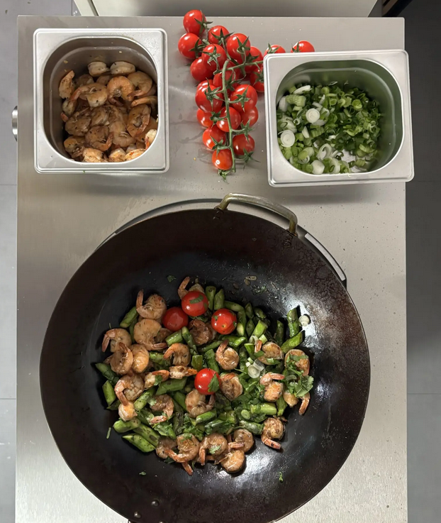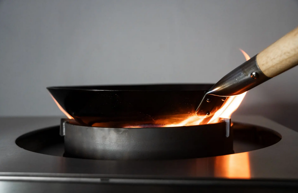 Neben dem mitgelieferten 38 cm Stahl-Wok können mit dem Pfannen-Aufsatz auch feuerfeste Töpfe und Pfannen auf dem Block R genutzt werden.