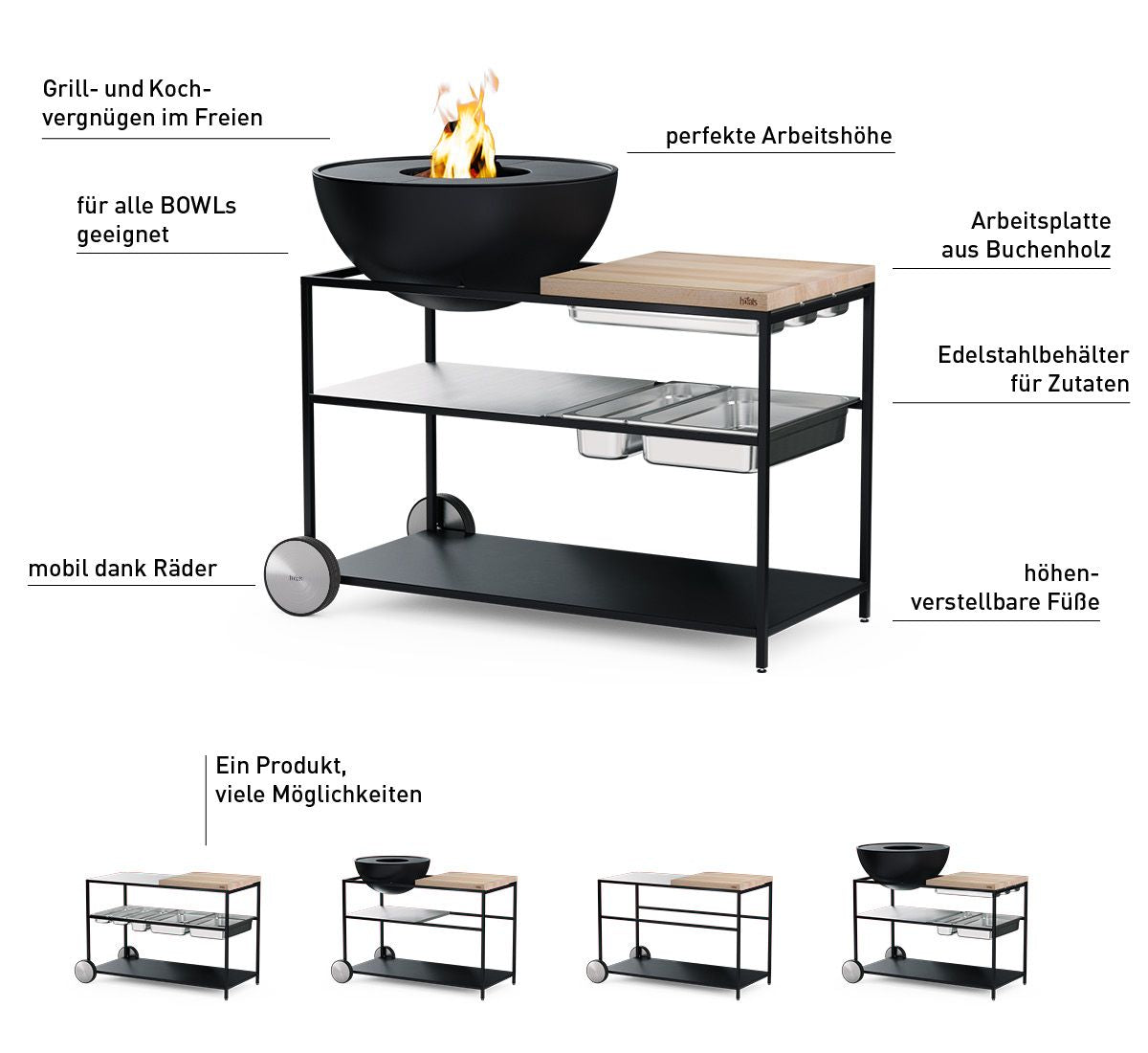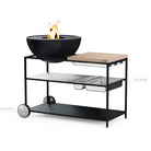 Der geschweißte Stahlrahmen mit integrierter Feuerschalenaufnahme passt für die BOWL, BOWL 57 und BOWL 70 und bietet auf drei Ebenen ausreichend Ablage- und Arbeitsfläche.
