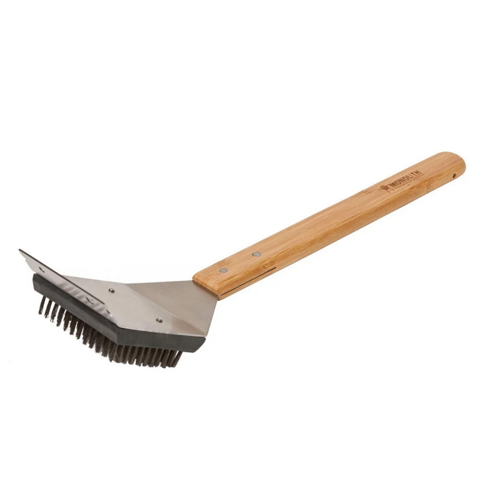 Mit dieser robusten MONOLITH Grillbürste ist die Reinigung der Edelstahl-Grillroste deines MONOLITH Keramikgrills ein Kinderspiel. Hergestellt aus erstklassigen Materialien, hat die Bürste die Fähigkeit, selbst hartnäckige Rückstände mühelos zu beseitigen. Obendrein ist sie ausgesprochen langlebig und robust. Der Griff aus Bambus überzeugt durch sein geringes Gewicht und die hohe Stabilität. Dadurch liegt die Bürste gut in deiner Hand und lässt sich mühelos bedienen. Der Bürstenkopf selbst hat robuste Edelstahlborsten, welche im Vergleich zu Messingborsten eine deutlich erhöhte Stabilität und Haltbarkeit aufweisen. Für mehr Nachhaltigkeit ist der Bürstenkopf austauschbar.