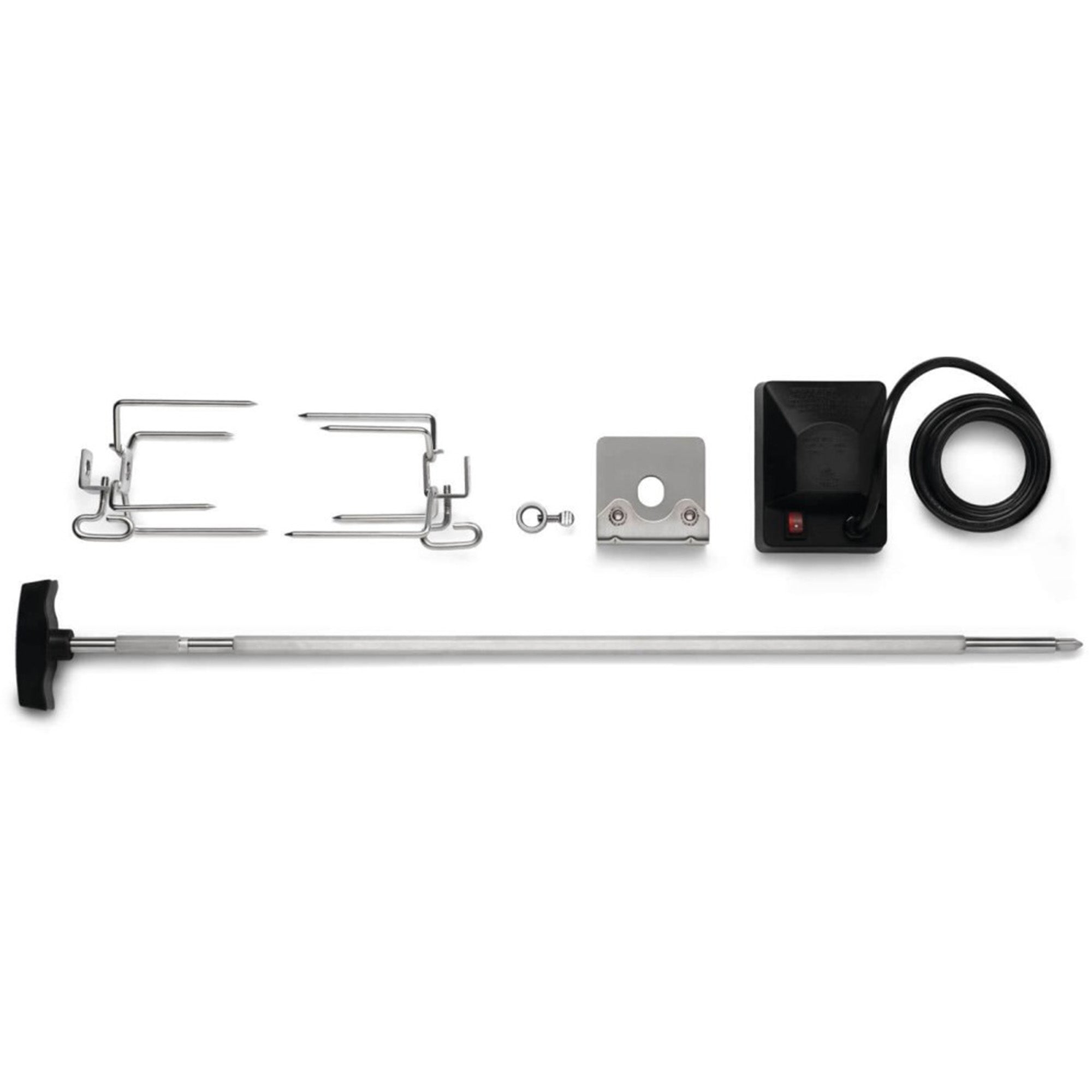 Inhalt des Kits: 1 robuster Drehspießmotor, 1 lebensmittelechter Edelstahl-Spießstab 2 große Drehspieß-Gabeln aus Edelstahl 1 eingebautes Gegengewicht aus Edelstahl 1 Stoppring aus Edelstahl 1 T-Griff