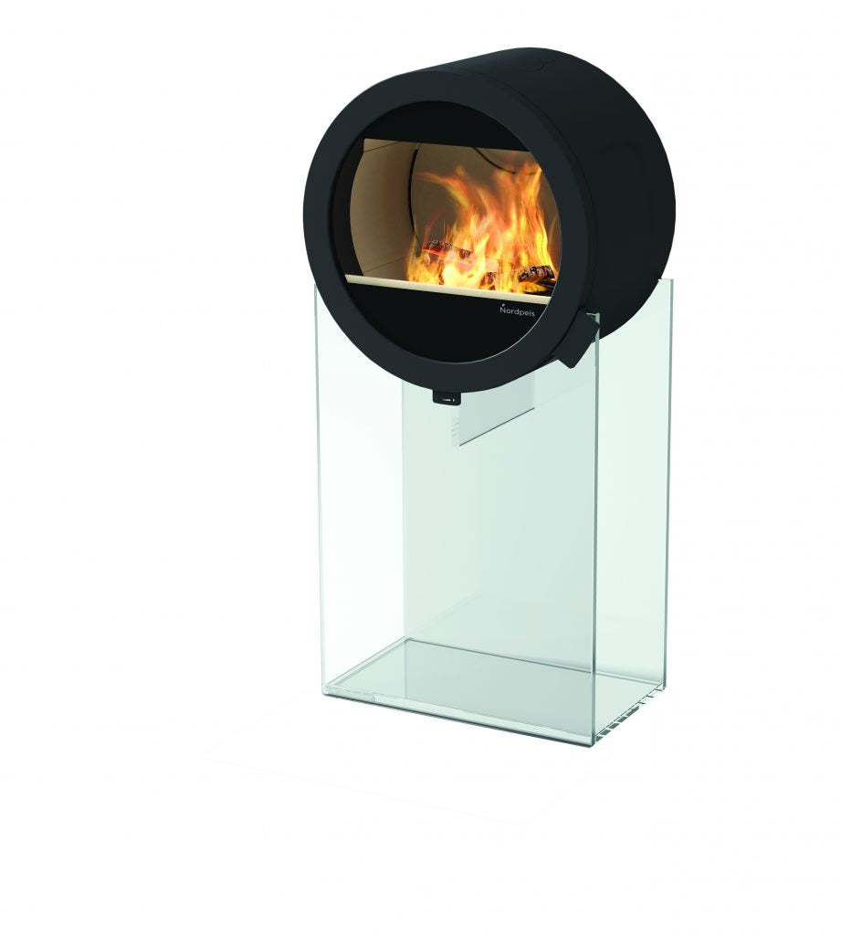 Nordpeis Me Glass hat einen exklusiven Glaskörper und ist der erste Kaminofen mit gläsernem Sockel. Das gelagerte Brennholz schafft einen interessanten Kontrast.
