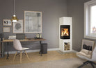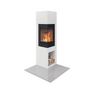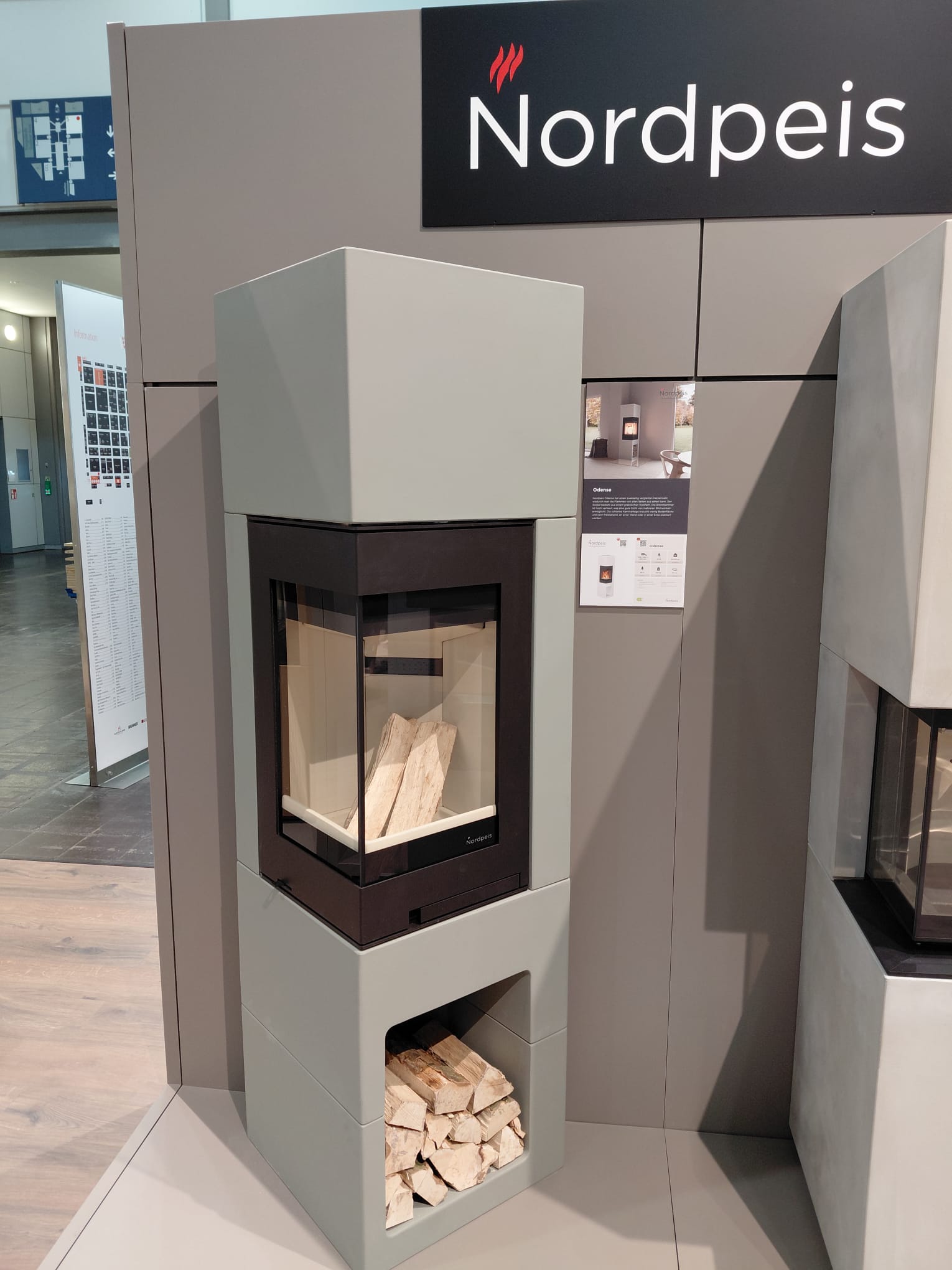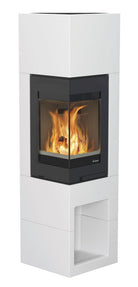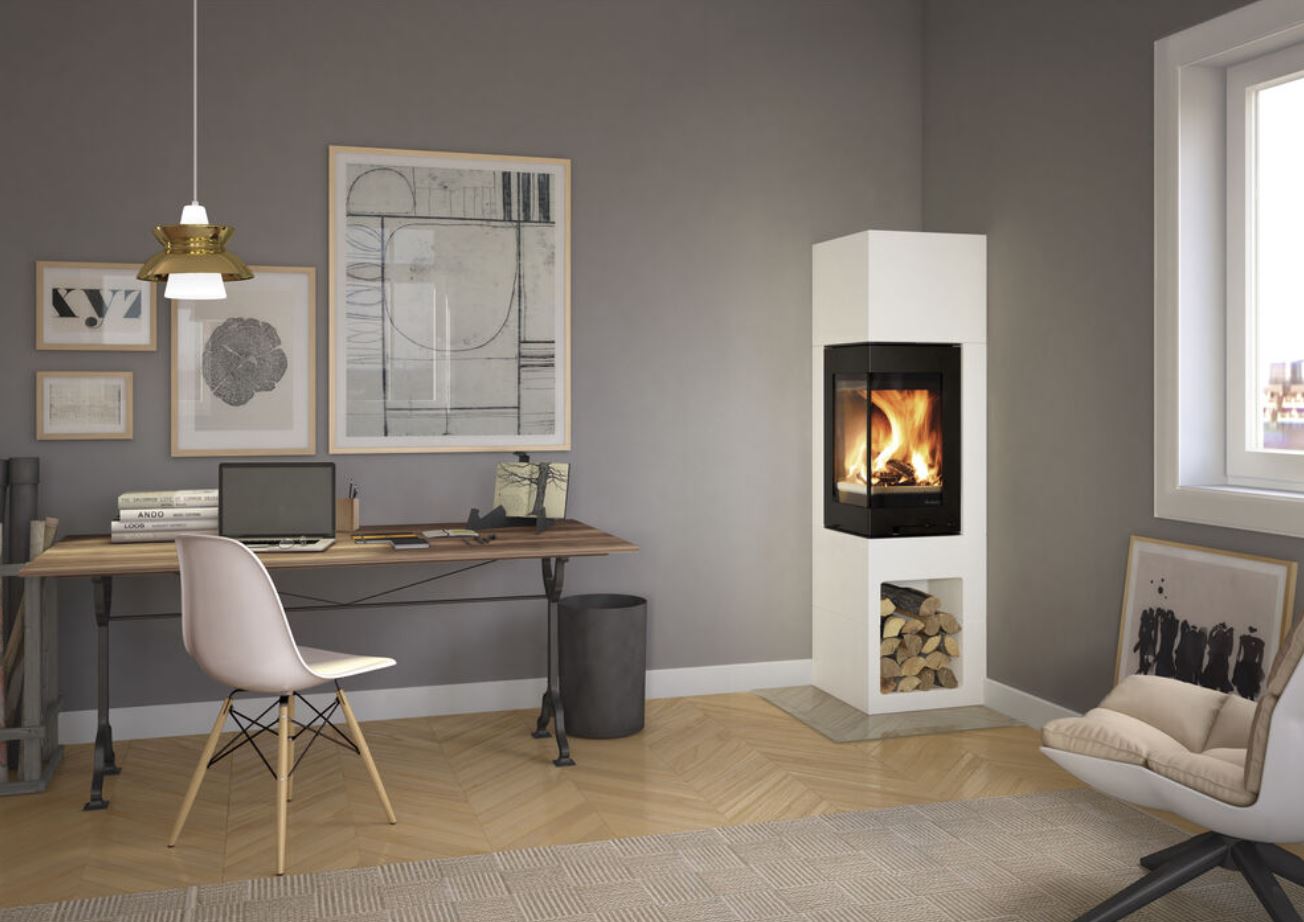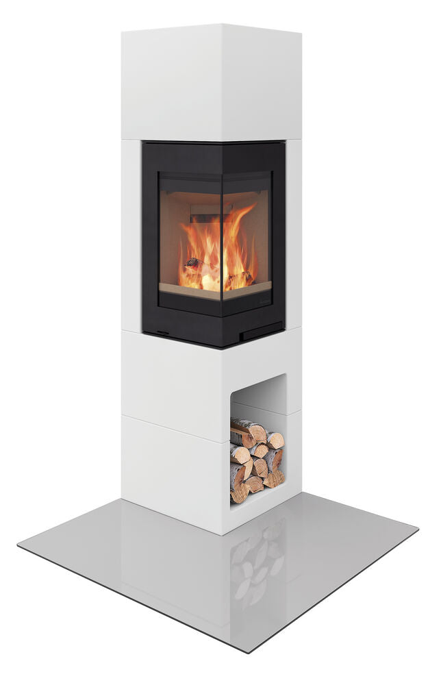 Nordpeis Odense hat einen zweiseitig verglasten Heizeinsatz, wodurch man die Flammen von allen Seiten aus sehen kann. Der Sockel besteht aus einem praktischen Holzfach. Die Brennkammer ist hoch verbaut, was eine gute Sicht von mehreren Blickwinkeln ermöglicht. Die schlanke Kaminanlage braucht wenig Bodenfläche und kann freistehend, an einer Wand oder in einer Ecke platziert werden.