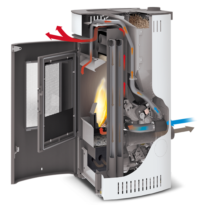 Fortschrittliche Technologie. Hochleistungswärmetauscher, selbstreinigende Scheibe und Brennkammer, Pellet Quality und Combustion Quality zur Optimierung von Verbrennung und Leistung, Night Mode für leises Heizen.