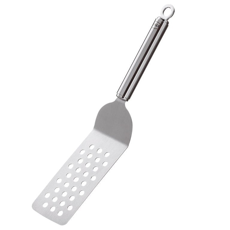 Zum leichten Wenden von z.B. Burgern. Durch die gekröpfte Form ideal zum Herausheben von Speisen aus der Grillpfanne oder von der Grillplatte. Durch die Lochung können Fett und Flüssigkeiten abtropfen.