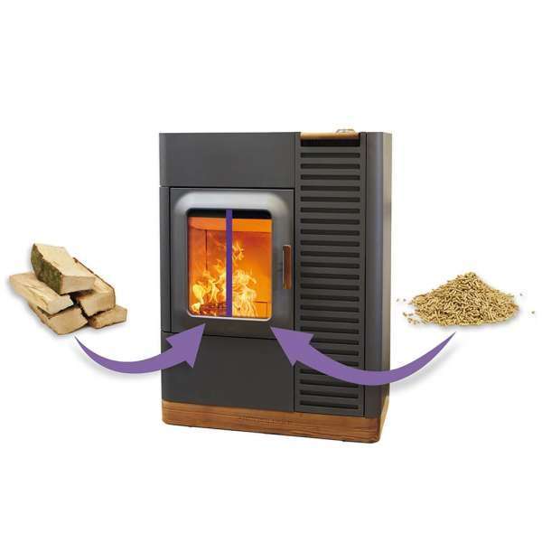 Dieses Kombigerät lässt sich mit Pellets oder Scheitholz beheizen und kombiniert so das Beste aus beiden Welten:
