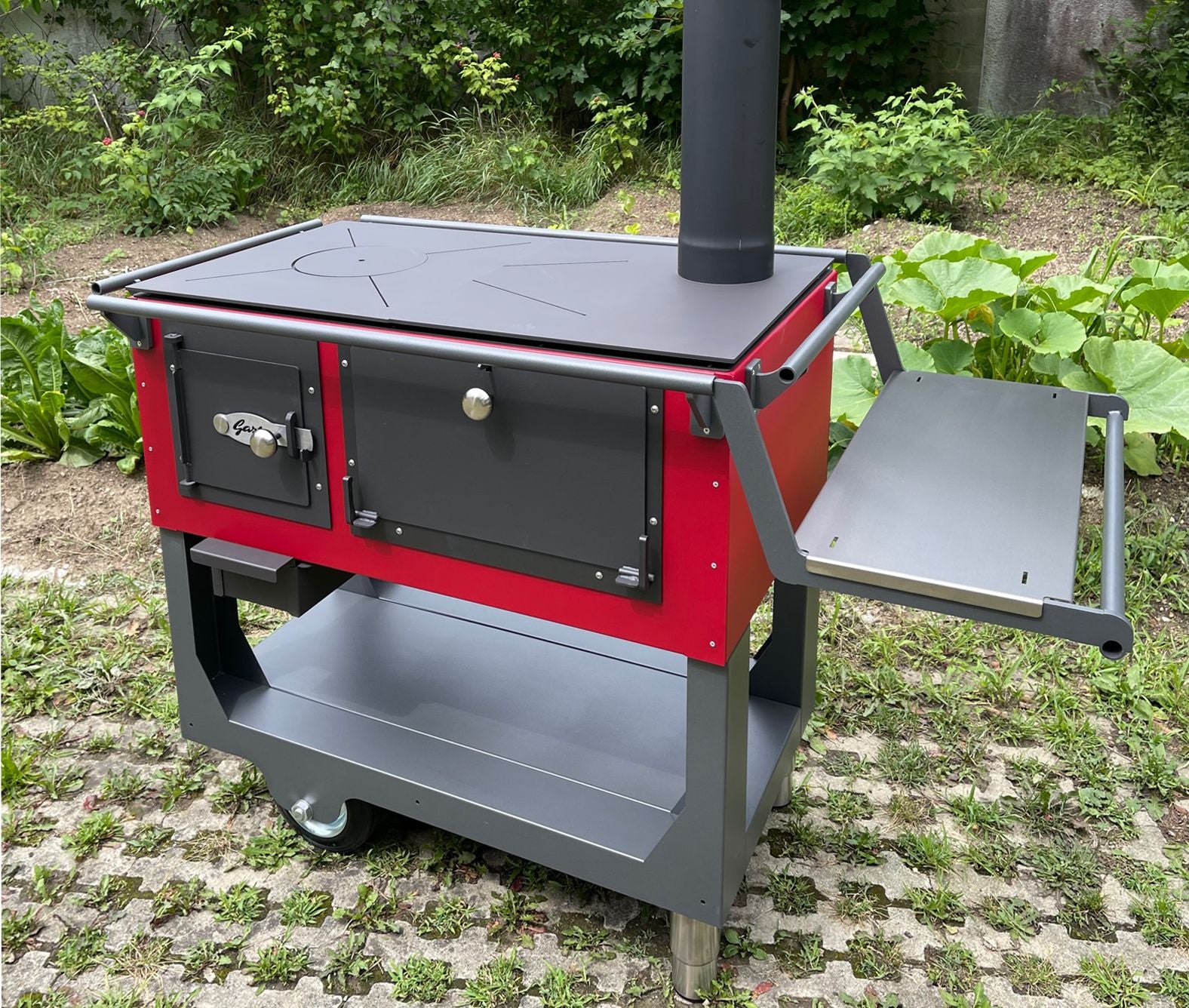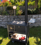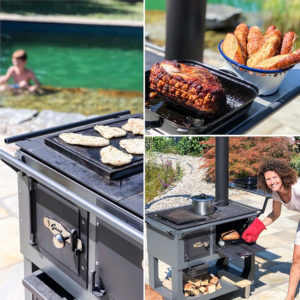 Beim Kochen und Braten auf der Terrasse und im Garten, bei einem gemütlichen Dinner zu zweit oder bei der Outdoor-Party mit Freunden. Der fahrbare Tischherd ist ein praktisches Kochgerät für die Outdoor Küche. Mit der eigens entwickelten Schiebestange und den massiven Rädern lässt er sich bequem auf der Terasse bewegen. Die Brennkammer ist mit Schamotte ausgekleidet und oben mit einer Platte aus hitzefestem Edelstahl abgedeckt. Der Innenraum des Herdes ist komplett mit Isolierung ausgekleidet.