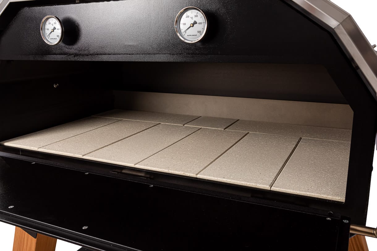 Ausstattung: Standardmäßig mit 9 Naturschamottsteine + einem ausziehbaren Grillrost. Für Vollgas Grillen, sind zwei weitere ausziehbare Grillroste optional erhältlich. Für den gesunden Genuss: Unsere 4,5 cm dicken schadstofffreien Naturschamottsteine werden lokal produziert. Einfach zum Einlegen. Der Naturschamottstein ist am unteren Boden gerillt, um die Hitze gleichmäßiger zu verteilen (Prinzip Fussbodenheizung).